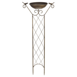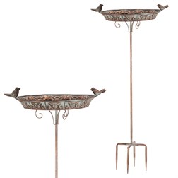 Krmítko/pítko - kovový zápich, miska s ptáčky, měděné-antik