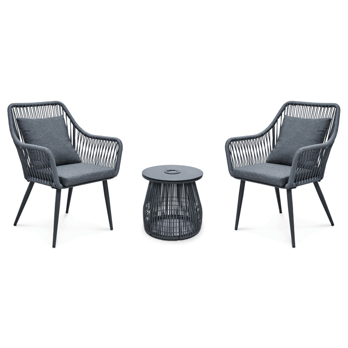 Zahradní set 1+2 v šedém provedení kombinuje pevnou kovovou konstrukci s komfortním čalouněním z látky, která je navržena pro snadnou údržbu a dlouhou životnost. Součástí setu jsou dvě pohodlná křesla s ergonomicky tvarovanými opěrkami a měkkými polštáři, které zajišťují příjemné posezení. Stolová deska je vyrobena z tvrzeného skla, které je odolné vůči poškrábání a snadno se čistí. Inovativní solární podsvícení stolku vytváří příjemnou atmosféru večerního posezení a zároveň je energeticky úsporné. Celý set je ideální pro relaxaci na terase či zahradě, přičemž jeho stabilní konstrukce zaručuje bezpečnost a nosnost vhodnou pro běžné užívání.