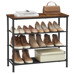 Botník v rustikálním stylu kombinuje desku z MDF s dekorem old wood v hnědém odstínu a pevnou kovovou konstrukci v inkoustově černé barvě. Nabízí tři prostorné police potažené polyesterovou tkaninou, které poskytují dostatek místa pro uložení obuvi i dalších drobných předmětů. Kovové nohy jsou opatřeny plastovými kluzáky, které chrání podlahu před poškozením a zajišťují stabilitu. Kompaktní rozměry 75 × 30 × 71 cm umožňují snadné umístění do předsíně či chodby, kde botník efektivně využívá prostor a zároveň přispívá k příjemné atmosféře díky rustikálnímu vzhledu.