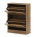 Botník s dvěma přihrádkami v dekoru jilm je vyroben z MDF desek v hnědém odstínu, který přináší do prostoru příjemnou přírodní atmosféru. Praktické výklopné dveře umožňují snadný přístup k uložené obuvi a zároveň šetří místo v předsíni. Pevné úchytky zajišťují pohodlnou manipulaci, zatímco kompaktní rozměry botníku umožňují jeho umístění i do menších prostor. Vnitřní prostor je rozdělen do dvou samostatných sekcí, které pomáhají udržet pořádek a přehlednost. Celkové provedení je navrženo pro dlouhou životnost a snadnou údržbu.