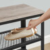 Botník v šedém provedení kombinuje desku z MDF s pevnou ocelovou podnoží a dvěma mřížkovými policemi, které poskytují praktický úložný prostor pro obuv. Deska je hladká s jemnou strukturou, která usnadňuje údržbu a odolává běžnému opotřebení. Ocelová konstrukce je opatřena práškovým lakem, což zajišťuje stabilitu a dlouhou životnost botníku. Díky rozměrům 100 × 30 × 45 cm se botník hodí do předsíní i menších prostor, kde efektivně využívá dostupné místo. Nastavitelné plastové patky chrání podlahu před poškozením a zajišťují rovnoměrnou stabilitu.