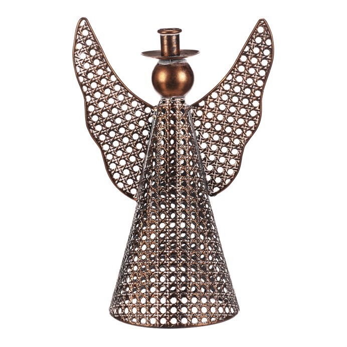 Kovový anděl vysoký přibližně 35 cm je elegantní vánoční dekorace v měděném odstínu. Na jeho kulaté hlavičce se nachází kalíšek přizpůsobený pro umístění kónické svíčky. Nabízí tak neodolatelnou kombinaci vkusné dekorace s možností vytvořit nádherný světelný efekt. Díky jemným kruhovým otvorům působí vzdušně a vkusně ozdobí váš interiér během svátečního období.