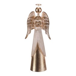 Kovový anděl v zářivém zlatém odstínu bude nádhernou vánoční dekorací pro váš domov. Se srdcem v rukou a elegantně tvarovanými křídly působí jemně a slavnostně. Díky výšce 57 cm se stane výrazným prvkem na stole, polici či komodě a dodá vašemu interiéru kouzlo svátečních dní.