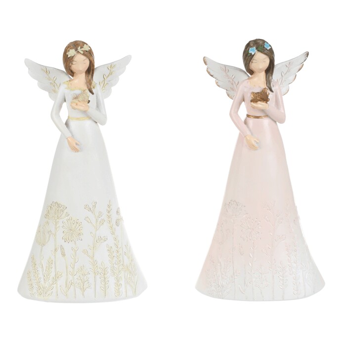 Figurka anděla vyrobená z polyresinu představuje jemně zpracovanou dekoraci s květinovým motivem na šatech a křídlech s jemnými detaily. Anděl drží motýla nebo srdce, což dodává výrobku symbolický nádech klidu a něhy. Povrch je laděn do pastelových odstínů růžové a modré, které působí jemně a vkusně. Díky své velikosti a stabilnímu provedení je vhodný pro umístění na poličku, komodu nebo jako součást tematické dekorace. Produkt je určen k postavení a přináší do prostoru příjemnou atmosféru s nádechem romantiky.