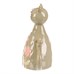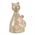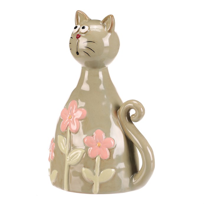 Keramická figurka kočky v zeleném odstínu je ozdobena jemnými květinovými motivy v růžové barvě, které dodávají dekoraci hravý a příjemný vzhled. Je určena k postavení a díky svému kompaktnímu provedení se hodí do různých interiérů, kde přispívá k útulné atmosféře. Povrch je hladký a lesklý, což podtrhuje detailní zpracování a barevnou kombinaci. Figurku lze umístit na poličku, komodu nebo pracovní stůl jako stylový doplněk.