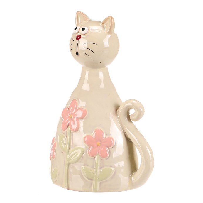 Keramická figurka kočky v žluto-zeleném provedení s jemně modelovanými květinami na těle přináší do interiéru hravý a barevný prvek. Její lesklý povrch zvýrazňuje detaily obličeje i elegantně zatočený ocas, což dodává dekoraci osobitý charakter. Velikost L umožňuje umístění na poličku, komodu nebo okenní parapet, kde vynikne jako samostatný dekorativní prvek. Figurku lze snadno kombinovat s dalšími dekoracemi pro vytvoření příjemné atmosféry v domácnosti.
