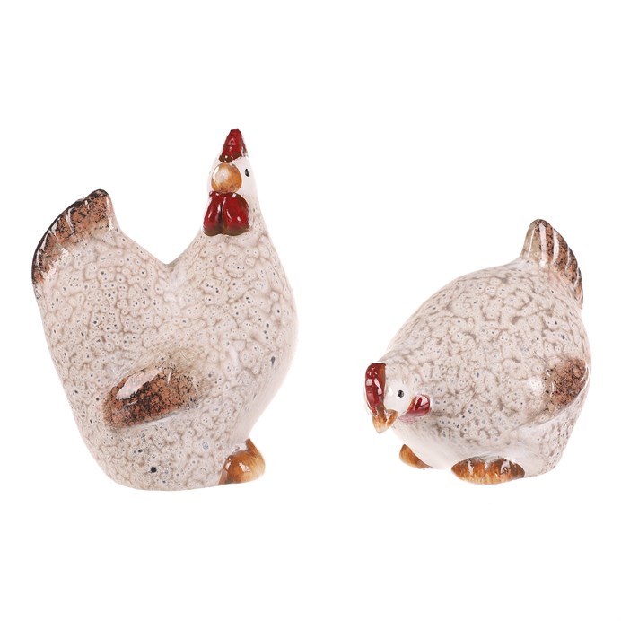 Keramická dekorace ve tvaru slepičky a kohouta v krémovém odstínu přináší do interiéru přírodní a rustikální atmosféru. Každá figurka je detailně zpracovaná s jemnou strukturou povrchu a barevnými akcenty na hřebenu, zobáku a ocasu, které podtrhují jejich charakter. Velikost M je vhodná pro umístění na poličku, komodu nebo jako součást tematické dekorace. Díky pevnému keramickému tělu se snadno udržují a jsou stabilní při postavení na rovný povrch. Jsou ideální pro doplnění venkovského stylu nebo jako originální dekorace do kuchyně či obývacího pokoje.