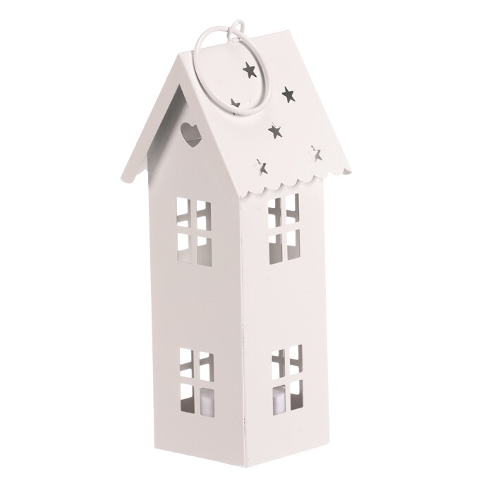Mini kovová lucerna ve tvaru patrového domku je půvabnou dekorací pro váš interiér. Bílá barva jí dodává jemný vzhled, zatímco detailně zpracovaná okénka a hvězdičkové otvory ve stříšce krásně propouštějí světlo LED svíčky. Můžete ji postavit na stůl nebo zavěsit za očko a vytvořit si tak kouzelnou atmosféru.