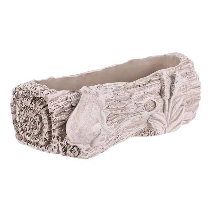 Obal na květiny z betonu v šedo-bílém odstínu imituje přírodní kmen stromu s detailním reliéfem žabky a rákosu, který dodává dekorativní a přírodní efekt. Pevné betonové provedení zajišťuje stabilitu a dlouhou životnost, materiál se snadno udržuje a je vhodný pro venkovní i vnitřní použití. Obal ve velikosti L nabízí dostatek prostoru pro středně velké rostliny a díky svému designu vynikne na terase, balkóně i v interiéru. Jeho tvar a textura přispívají k autentickému vzhledu dřeva, což podtrhuje přírodní atmosféru prostoru.