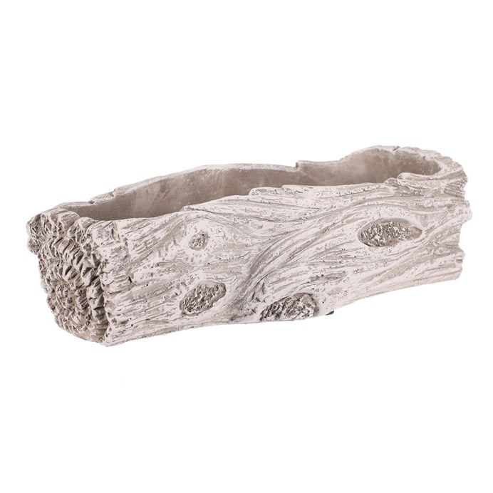 Obal na květiny z betonu v šedo-bílém odstínu imituje tvar vykotlaného stromového kmene s detailním reliéfem kůry a letokruhů. Jeho robustní provedení zajišťuje stabilitu a dlouhou životnost, přičemž betonový materiál se snadno udržuje. Díky délce ve velikosti L poskytuje dostatek prostoru pro větší rostliny či aranžmá. Tento dekorativní obal vnáší do interiéru nebo exteriéru přírodní atmosféru a vizuální efekt dřeva bez nutnosti údržby živého materiálu.