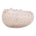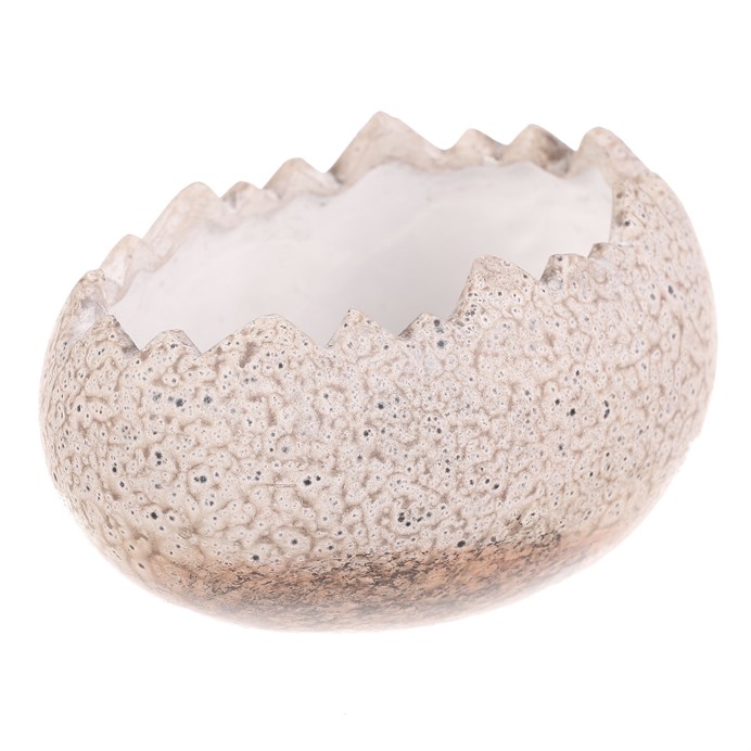 Keramický obal na květiny ve tvaru vajíčka v krémovém odstínu zaujme svým originálním designem s nepravidelným okrajem připomínajícím rozlomenou skořápku. Povrch má jemně strukturované provedení, které dodává dekoraci přírodní a rustikální vzhled. Velikost M je vhodná pro menší rostliny nebo aranžmá, které vyniknou v interiérech i na terasách. Obal je vyroben z kvalitní keramiky, která je navržena pro dlouhou životnost a snadnou údržbu.