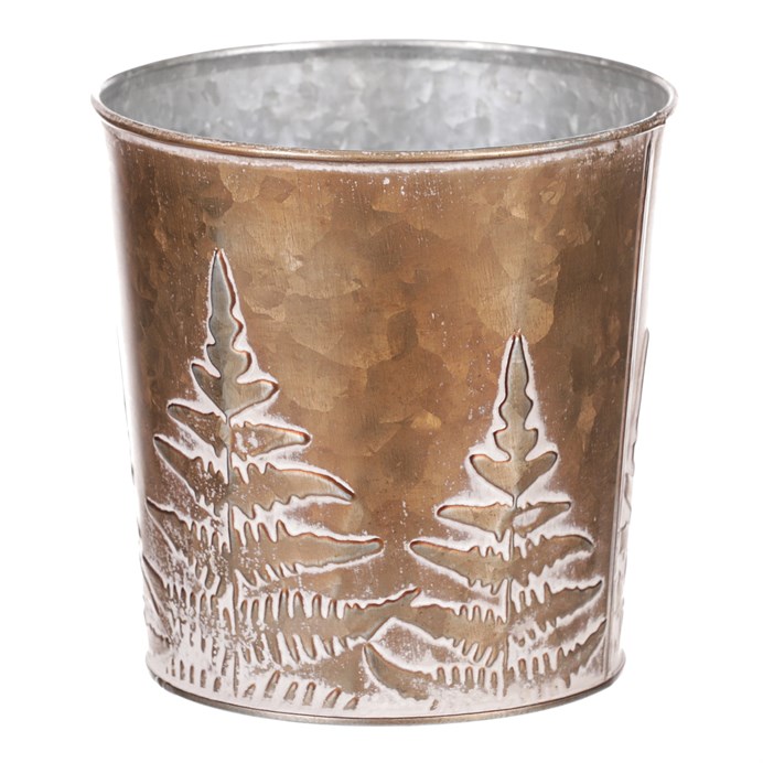 Obal z kovu na květiny, v měděné barvě s kapradím.