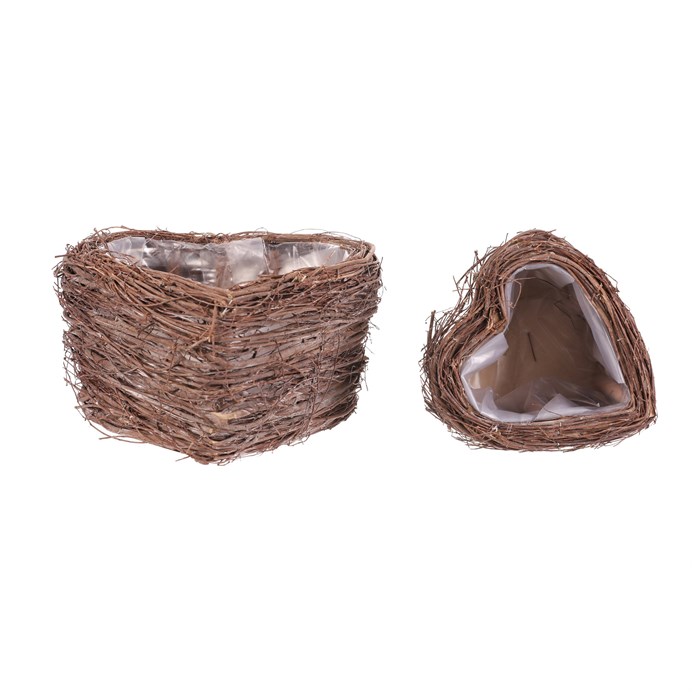 Sada dvou proutěných obalů ve tvaru srdce v přírodním odstínu přináší do interiéru jemný rustikální efekt. Každý obal je vyroben z pevného proutí a opatřen igelitovou vložkou, která usnadňuje použití s květinami nebo jinými dekoracemi. Přírodní barva a tvar srdce vytvářejí příjemnou atmosféru vhodnou pro různé stylové aranžmá. Obaly jsou vhodné pro umístění na stůl, parapet nebo poličku a lze je využít jak samostatně, tak jako dekorativní pár.