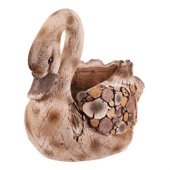 Dekorativní obal na květiny ve tvaru labutě je vyroben z magnesia s povrchovou úpravou připomínající dřevo. Jeho detailně zpracované tělo s texturou dřeva a barevnými akcenty na křídlech přináší přírodní vzhled vhodný pro zahradní i interiérové aranžmá. Obal nabízí dostatečný prostor pro květináč a zároveň působí jako stylový dekorativní prvek. Hnědé provedení ladí s různými typy rostlin a doplňuje přírodní atmosféru prostoru. Vhodný pro umístění na terasu, balkon nebo do zahrady.