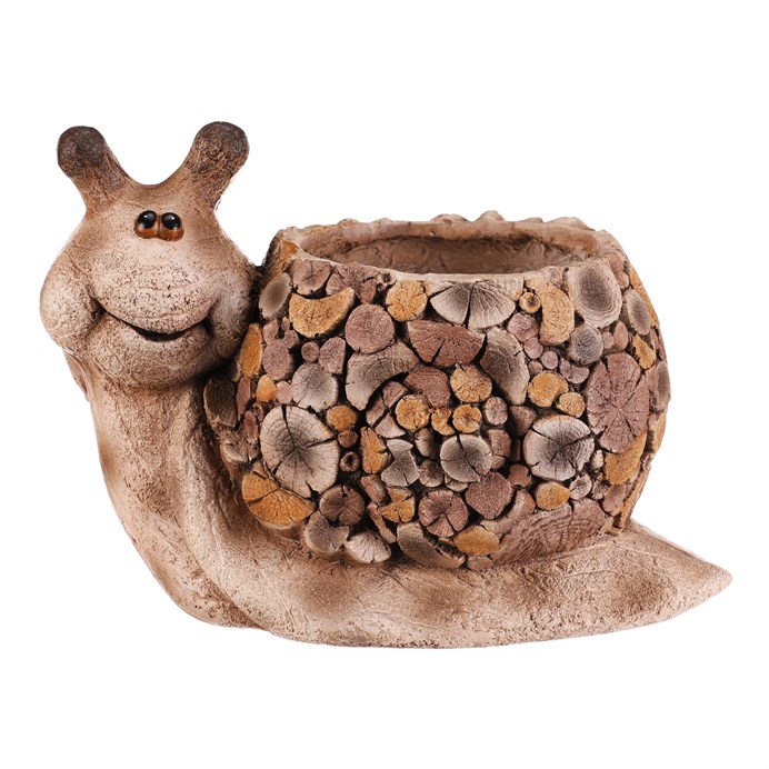 Dekorativní obal na květiny ve tvaru šneka je vyroben z magnesia s povrchem připomínajícím dřevo. Jeho detailní provedení s texturou dřevěných špalků dodává přírodní a rustikální vzhled, který vynikne v zahradě i na terase. Obal je vhodný pro různé druhy květin a rostlin, přičemž jeho stabilní základna zajišťuje bezpečné umístění květináče. Hnědá barevná varianta podtrhuje přírodní charakter dekorace a snadno se kombinuje s okolním prostředím.