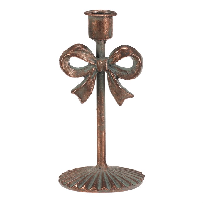 Kovový svícen v měděném odstínu zaujme svým dekorativním provedením s výraznou mašlí uprostřed. Je určen pro kónické svíčky a díky pevné základně poskytuje stabilní oporu. Jeho výška 16 cm umožňuje snadné umístění na stůl, komodu nebo poličku, kde vytvoří příjemnou atmosféru. Povrchová úprava s patinou dodává svícnu rustikální charakter a vizuální efekt starožitnosti.