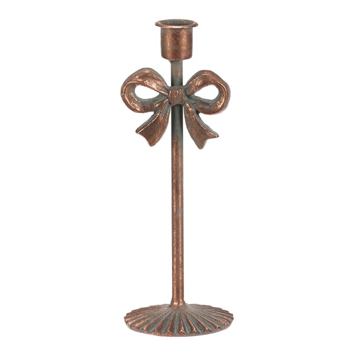 Kovový svícen v měděném odstínu zaujme dekorativní mašlí uprostřed stojanu, která dodává jemný a stylový detail. Je určen pro kónické svíčky a díky pevné základně s jemným žebrováním stojí stabilně na rovném povrchu. Výška 22 cm umožňuje umístění na stůl, komodu nebo poličku, kde vytvoří příjemnou atmosféru. Povrchová úprava s patinou podtrhuje vintage vzhled a snadno se udržuje.