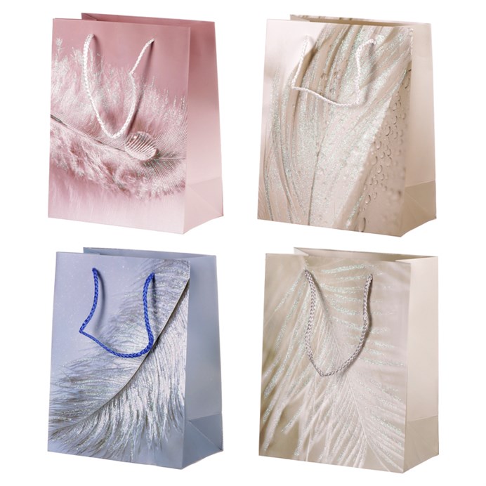 Rozdávejte radost ostatním i sobě darováním hezkých věcí prostřednictvím papírové dárkové tašky s tímto krásným dekorem peří. Její rozměry umožňují vložit do ní i více dárků současně, a přesto zůstává dostatečně pevná a odolná, aby pojmula i větší zátěž. Je vyrobena tak, aby zaručovala komfort při nošení, což umožňují látková ucha jemná na dotek. Její jednoduchý a vkusný vzhled zahrnují esteticky provedené vzory s různými barevnými variantami. V této sadě máte na výběr z více druhů dárkových tašek lišící se barvou a odlišným dekorativním potiskem. Rozšíří se vám tak možnost výběru, čímž snáze zvolíte nejvhodnější variantu pro obdarovaného.