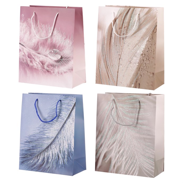 Rozdávejte radost ostatním i sobě darováním hezkých věcí prostřednictvím papírové dárkové tašky s tímto krásným dekorem peří. Její rozměry umožňují vložit do ní i více dárků současně, a přesto zůstává dostatečně pevná a odolná, aby pojmula i větší zátěž. Je vyrobena tak, aby zaručovala komfort při nošení, což umožňují látková ucha jemné na dotek. Její jednoduchý a vkusný vzhled zahrnují esteticky provedené vzory s různými barevnými variantami. V této sadě máte na výběr z více druhů dárkových tašek lišící se barvou a odlišným dekorativním potiskem. Rozšíří se vám tak možnost výběru, čímž snáze zvolíte nejvhodnější variantu pro obdarovaného.