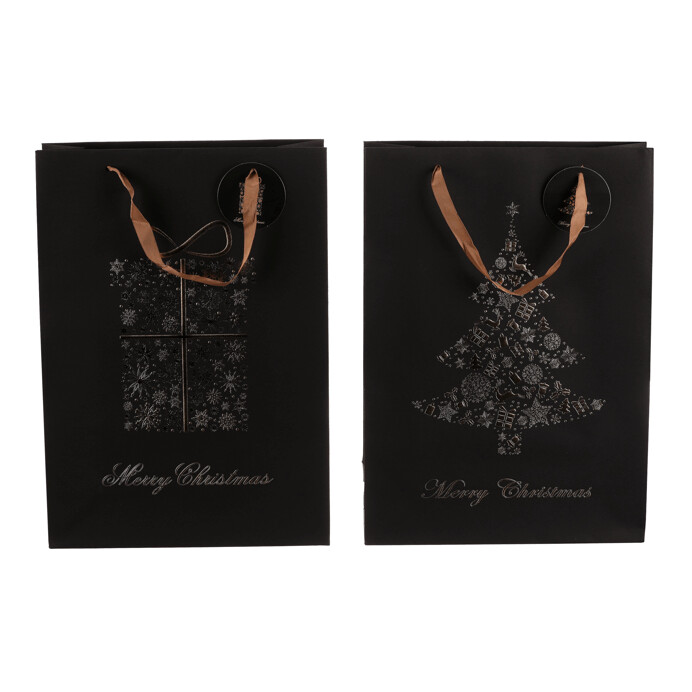 Dárková papírová taška v elegantní černé barvě se zlatým vzorem je dostupná ve dvou variantách, buď s motivem vánočního stromku, nebo dárku. Díky svému stylovému vzhledu dodá vašim dárků luxusní nádech. Do tašky se dárek snadno vloží, což ušetří čas při balení. Navíc se dobře nosí a vypadá skvěle pod stromečkem.