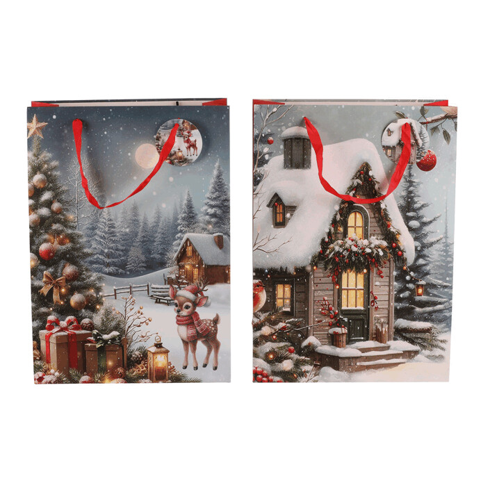 Dárková papírová taška s nádhernými zimními motivy. Máte na výběr mezi zasněženou chaloupkou nebo vánočním stromkem s dárky a srnečkem. Stylové a praktické řešení, které ušetří čas a dodá vašim dárkům kouzelný vzhled. Už žádné složité a zdlouhavé balení do papíru, stačí vložit a máte hotovo!