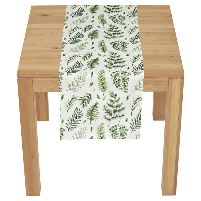 Běhoun s motivem mixu zelených listů na bílém polyesterovém podkladu přináší do interiéru svěží přírodní akcent. Rozměry 40 x 150 cm umožňují jeho univerzální použití na stoly různých velikostí, kde zvýrazní dekorativní efekt. Materiál 100 % polyester zajišťuje snadnou údržbu a odolnost proti pomačkání, což usnadňuje každodenní použití. Jemná textura a barevné provedení vytvářejí příjemnou atmosféru vhodnou pro moderní i klasické prostory. Běhoun je ideální pro doplnění stolního aranžmá nebo jako samostatný dekorativní prvek.