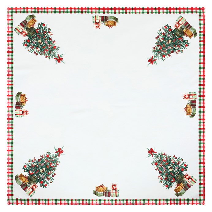 Bílý ubrus s lemovanými červeno zelenými okraji, barevnými vánočními stromky a dárečky, bude výbornou volbou na prostření svátečního stolu. Jeho rozměry jsou 80 x 80 cm a je ze 100% polyesteru. Jeho oku lahodící design bude nádherně doplňovat vánoční výzdobu vašeho interiéru a navodí tu pravou sváteční atmosféru.