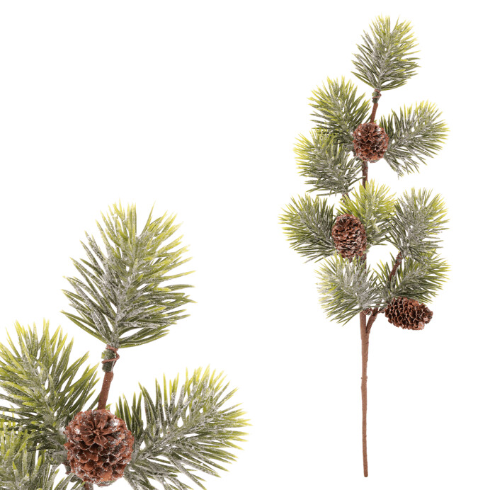 Umělá větev jehličí v zeleném odstínu je doplněna několika šiškami a mírným ojíněním, které dodává přírodní vzhled. Větev je vyrobena z plastu, což zajišťuje snadnou údržbu a dlouhou životnost. Vhodně poslouží jako dekorativní prvek v interiérech i aranžmá s vánoční tematikou. Její detailní zpracování věrně napodobuje skutečné jehličí a přináší do prostoru příjemnou atmosféru.
