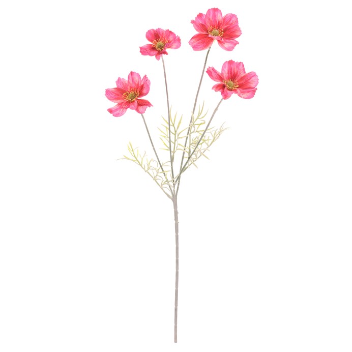 Umělá řezaná květina krásenka v tmavě růžovém odstínu přináší do interiéru živý barevný akcent bez nutnosti péče. Květina je vyrobena z textilu, který věrně napodobuje přirozenou strukturu a jemnost okvětních lístků. Pět květů různých velikostí je uspořádáno na tenkém stonku s jemnými zelenými listy, což vytváří přirozený a vzdušný vzhled. Vynikne v aranžmá samotná i jako součást větších dekorací, kde dodá prostoru svěžest a barevný kontrast.