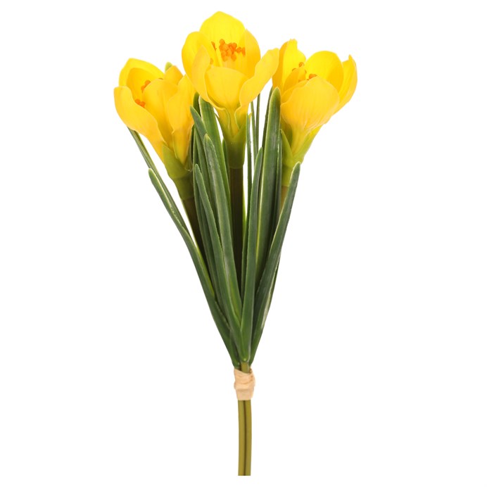 Umělá kytice krokusů v trsu v jasně žluté barvě přináší do interiéru svěží jarní atmosféru bez nutnosti péče. Květiny jsou vyrobeny z plastu s věrně zpracovanými okvětními lístky a zelenými listy, které působí přirozeně. Díky kompaktnímu svazku je vhodná pro aranžmá ve váze, na stole nebo jako dekorace na poličce. Krokusy jsou pevně svázány, což usnadňuje jejich úpravu a umístění. Ideální volba pro dlouhodobé dekorování prostor s přírodní barevností.