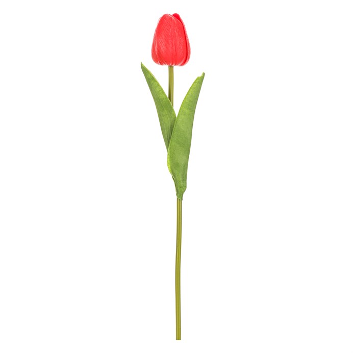 Umělý řezaný tulipán v červené barvě je vyroben z polyuretanové pěny, která věrně napodobuje přirozenou strukturu květu i listů. Jeho štíhlý stonek a detailní listy dodávají dekoraci realistický vzhled, který oživí každý interiér. Vynikne samostatně ve váze i jako součást květinové aranžmá. Díky použitým materiálům se snadno udržuje a dlouhodobě si zachovává svůj tvar i barvu.