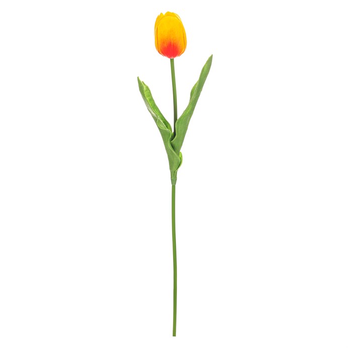 Umělý řezaný tulipán v žluto-oranžovém odstínu je vyroben z polyuretanové pěny, která věrně napodobuje přirozenou strukturu květu i listů. Jeho štíhlý stonek a detailní listy dodávají dekoraci realistický vzhled, který oživí každý interiér. Vynikne samostatně ve váze i jako součást květinové aranžmá, přičemž nevyžaduje žádnou údržbu ani zalévání. Díky lehkému materiálu je snadno manipulovatelný a vhodný pro dlouhodobé použití v domácnostech i komerčních prostorách.