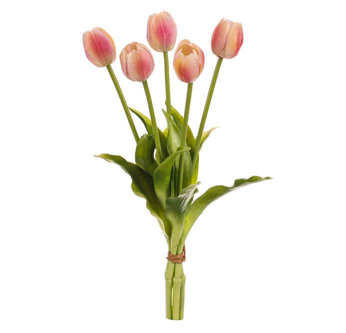 Svazek pěti světle růžových tulipánů z měkkého umělého plastu nabízí věrnou imitaci přírodních květin s jemnou texturou okvětních lístků a přirozenými odstíny. Každý květ je upevněn na dlouhém stonku s několika zelenými listy, které dodávají celku plnost a živý vzhled. Svazek je vhodný pro aranžmá v interiéru, kde přinese trvalou dekoraci bez nutnosti péče. Jemné barevné provedení se hodí do různých stylů dekorací, od moderních po klasické.