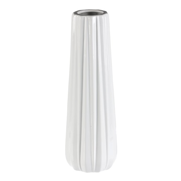 Keramická váza v bílé barvě s jemnými svislými vlnkami na povrchu, přináší do vašeho prostoru sofistikovanou eleganci. Její jemný a postupně se zužující tvar, v kombinaci s jednolitým barevným provedením, skvěle doplní jakýkoli vybraný prostor a vytvoří neodolatelné aranžmá, ať už s květinami, nebo jinými dekoracemi.