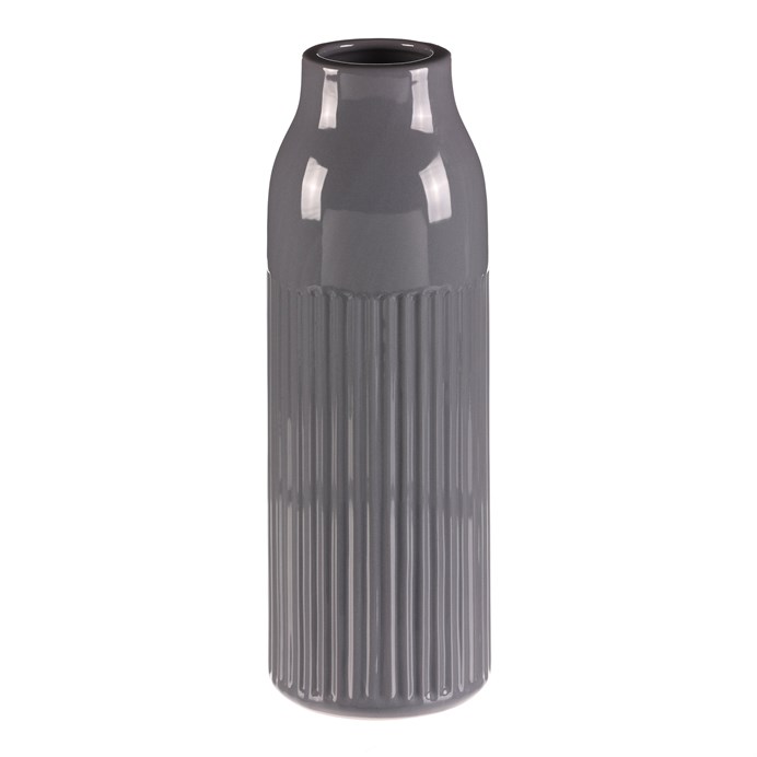 Keramická váza v šedé glazované barvě se zúženým hrdlem a jemným vzorem svislých vlnek na povrchu, dodá vašemu interiéru elegantní a sofistikovaný vzhled. Jednobarevné provedení a hladký design z ní činí univerzální dekoraci a skvělý základ pro oblíbené květiny. Hodí se tak do jakéhokoli prostoru, ať už na stůl, poličku nebo komodu.