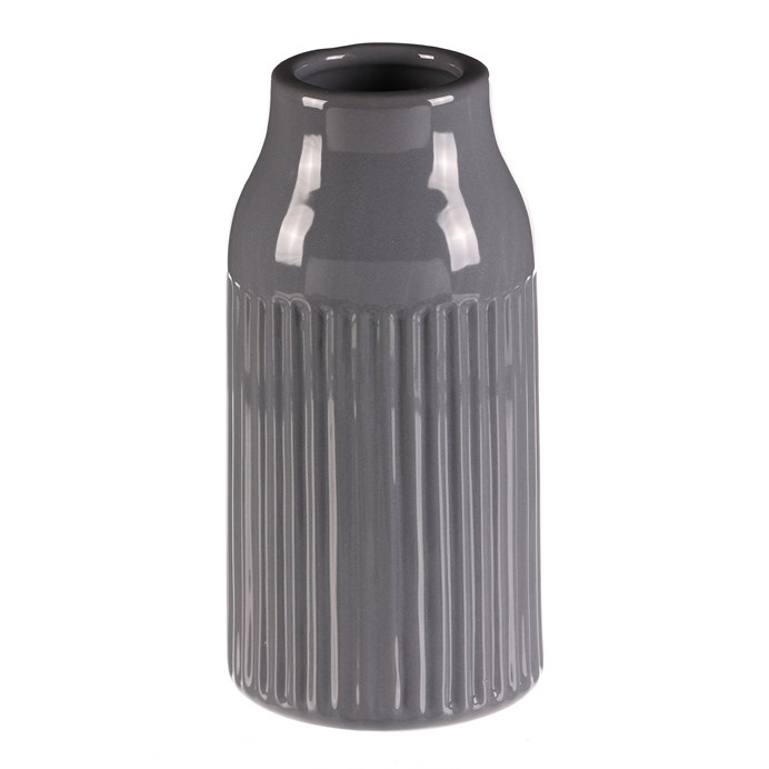 Keramická váza v šedé glazované barvě se zúženým hrdlem a jemným vzorem svislých vlnek na povrchu, dodá vašemu interiéru elegantní a sofistikovaný vzhled. Jednobarevné provedení a hladký design z ní činí univerzální dekoraci a skvělý základ pro oblíbené květiny. Hodí se tak do jakéhokoli prostoru, ať už na stůl, poličku nebo komodu.