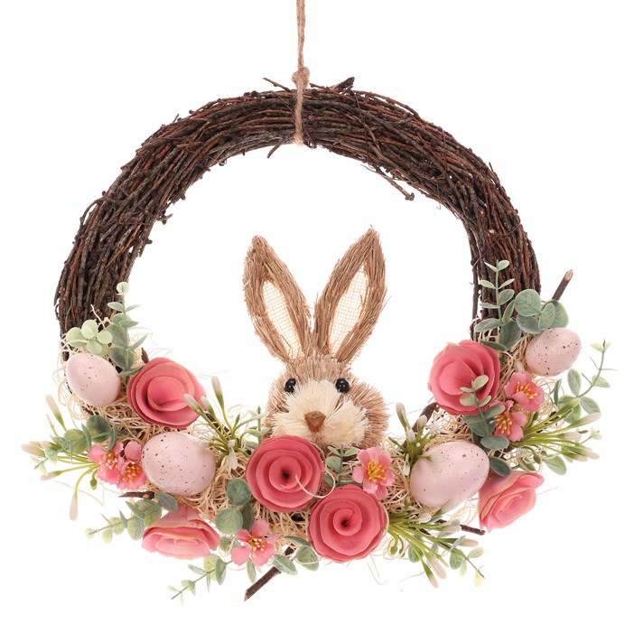 Věnec proutěný - pr. 32 cm, zajíc, růžové květy a vajíčka