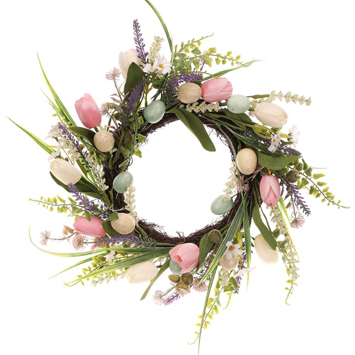 Věnec umělý - pr. 45 cm, zeleň, barevná vajíčka a květy