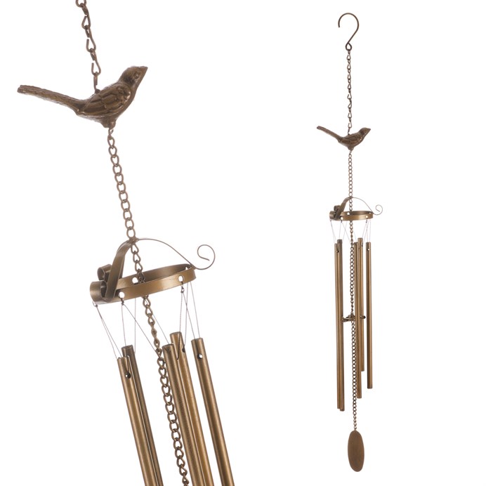 Zvonkohra vytváří při pohybu větru jemnou melodii a tím napomáhá obohatit okolní prostředí o příjemný zvukový efekt. Konstrukce je tvořena jemnými kovovými trubičkami zavěšenými na provázku. Díky tomu při závanu větru do sebe naráží a vytváří tím onen líbivý zvuk. Konkrétně tato je navíc ozdobena siluetou ptáčka a je v krásné měděné barvě. V některých případech může zvonkohra plnit i užitečnou funkci tím, že odežene nezvané návštěvníky v podobě ptáků či jiných živočichů, kteří by si jinak třeba pochutnali na naší úrodě. Zvonkohru můžeme díky háčku na řetízku zavěsit na hřebíček v pergole, altánku, nebo za jakoukoli vhodnou větev poblíž.