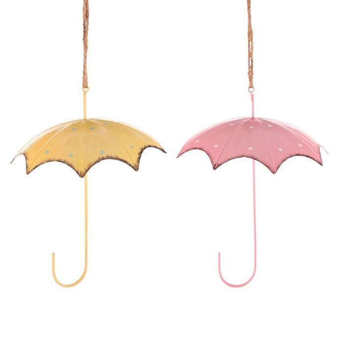 Deštník na pověšení je krásná kovová dekorace, která dodá vašemu prostoru jarní nádech. K dispozici ve dvou variantách, v jemných odstínech žluté nebo růžové, tyto deštníky na provázku přinášejí hravou atmosféru a barevnost. Ideální pro zavěšení na terasu, balkon nebo do interiéru, budou nejen stylovým prvkem, ale i příjemným osvěžením po dlouhé zimě.