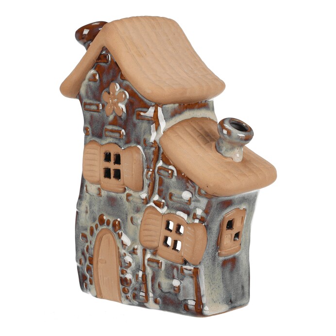Keramický domeček v hnědém provedení je určený pro umístění čajové svíčky, která v jeho útrobách vytváří příjemnou atmosféru. Detailní zpracování připomíná tradiční kamenný dům s okny a dveřmi, střecha je matná a jemně strukturovaná. Díky kombinaci lesklé a matné glazury působí dekorace vizuálně zajímavě a přirozeně. Domeček je vhodný pro použití v interiéru jako dekorativní prvek, který oživí každý prostor. Jeho rozměry odpovídají velikosti M, což zajišťuje snadné umístění na poličku nebo stůl.