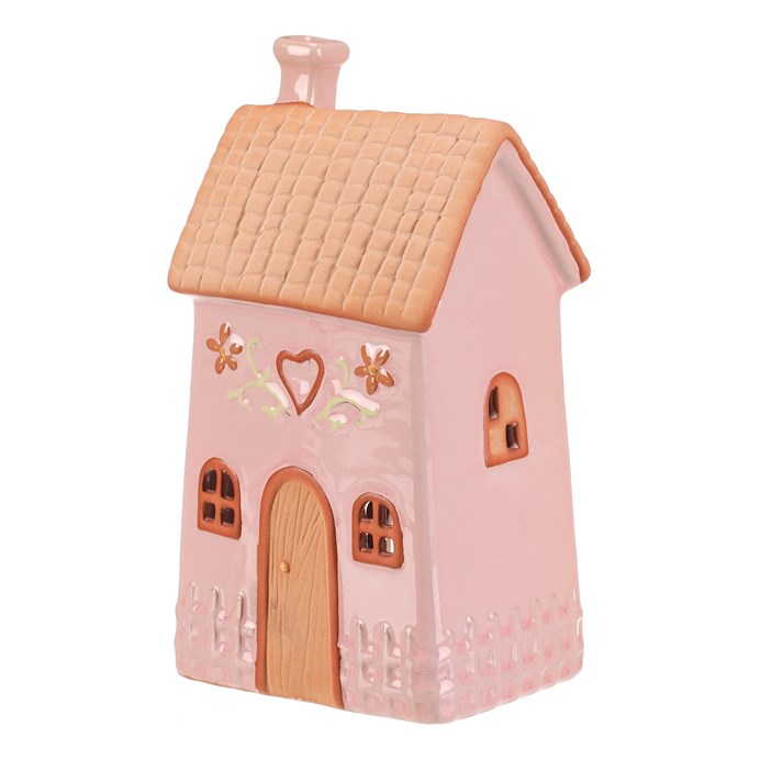 Keramický domeček v růžovém odstínu je určený pro umístění čajové svíčky, která v něm vytváří příjemnou atmosféru díky jemnému prosvětlení okének. Jeho detailní zpracování zahrnuje reliéfní střechu s jemnou texturou a malované dekorace ve tvaru květin a srdce na fasádě. Domeček má komín a dveře s výraznou texturou dřeva, které podtrhují jeho dekorativní charakter. Díky keramickému materiálu se snadno udržuje a je vhodný jako dekorace do interiéru, kde přidá útulný vizuální efekt.