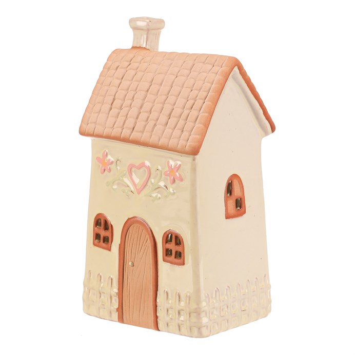 Keramický domeček ve žluto-zeleném odstínu je určený pro umístění čajové svíčky, která v něm vytváří příjemnou a teplou atmosféru. Detailní zpracování střechy s reliéfními taškami a jemné květinové motivy na fasádě podtrhují jeho dekorativní charakter. Malá okénka a dveře dodávají výrobku realistický vzhled a umožňují rozptýlení světla. Domeček je vhodný jako dekorace do interiérů, kde přispívá k útulnému prostředí.