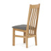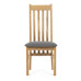 Jídelní židle s vysokým opěrákem je vyrobena z masivního dubového dřeva, které zajišťuje pevnost a stabilitu. Opěrák je ergonomicky tvarovaný svislými lamelami, které podporují správné držení těla při sezení. Sedák je čalouněný šedou látkou, která nabízí příjemný povrch a snadnou údržbu. Masivní nohy doplňují robustní konstrukci, jež je navržena pro dlouhou životnost. Židle nemá područky ani otočný mechanismus, což ji činí vhodnou pro klasické jídelní prostory s důrazem na jednoduchost a funkčnost.