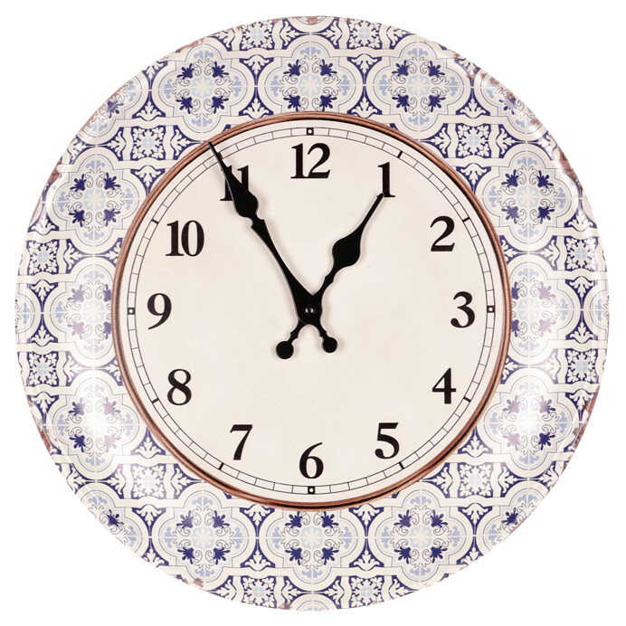 Hodiny nástěnné - pr. 35 cm, kovové, modro-bílé ornamenty