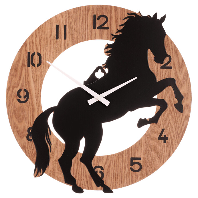 Nástěnné hodiny s průměrem 40 cm kombinují přírodní vzhled MDF s kovovým motivem koně na zadních nohách, který vytváří výrazný vizuální efekt. Číselník je tvořený dřevěnou základnou v přírodních odstínech, doplněnou o černé kovové ručičky a číslice, což zajišťuje dobrou čitelnost času. Hodiny jsou vhodné pro zavěšení v obývacím pokoji, pracovně nebo v dětském pokoji, kde vynikne jejich originální design. Provedení je navrženo tak, aby bylo snadné upevnění na stěnu a zároveň odolné vůči běžnému opotřebení. Kombinace materiálů MDF a kovu přináší do interiéru příjemný kontrast a zároveň praktickou funkčnost.