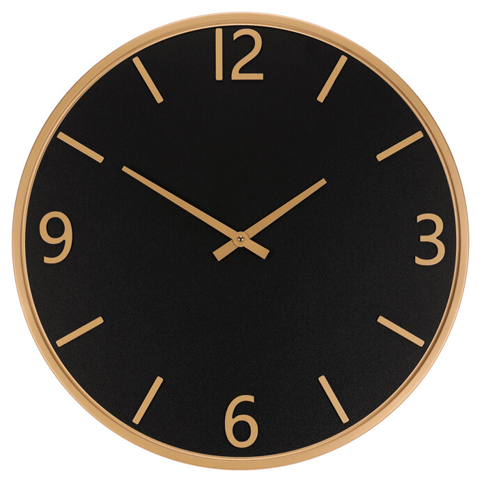 Nástěnné hodiny o průměru 60 cm kombinují černý melaminový ciferník s kovovým rámem v zlatém odstínu, který dodává hodinám moderní a zároveň nadčasový vzhled. Číslice a ručičky jsou v kontrastní zlaté barvě, což zajišťuje dobrou čitelnost času i z větší vzdálenosti. Hodiny jsou vhodné pro různé interiérové styly, kde vyniknou jako praktický a zároveň designový doplněk. Povrch ciferníku je matný, což minimalizuje odlesky a usnadňuje odečet času. Díky kvalitnímu provedení materiálů jsou hodiny navrženy pro dlouhou životnost a snadnou údržbu.