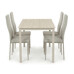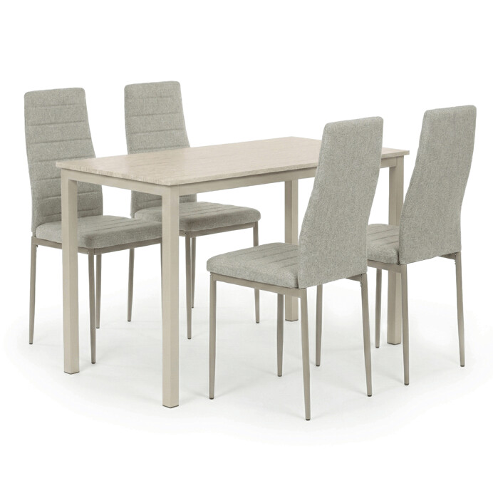 Jídelní set 1+4 kombinuje praktický stůl s rozměry 110x70x75 cm a čtyři pohodlné židle v krémovém odstínu. Deska stolu je vyrobena z MDF s dekorativním povrchem v odstínu travertinu, který napodobuje přírodní kámen a snadno se udržuje. Stabilní kovové nohy stolu v barvě cashmere zajišťují pevnost a dlouhou životnost, zatímco židle mají kovovou konstrukci v cappuccino odstínu a jsou čalouněné příjemnou látkou, která podporuje komfort při sezení. Nadčasový design celého setu se hodí do různých interiérů a díky kvalitnímu zpracování je vhodný pro každodenní použití v domácnosti i menších provozech.