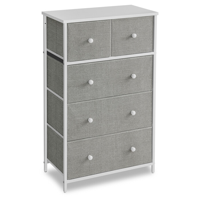 Komoda o rozměrech 56x30x93 cm kombinuje pevnou kovovou konstrukci s bílou MDF deskou v dekoru dřeva, která je upravena matným povrchem pro snadnou údržbu. Čtyři prostorné zásuvky z netkané textilie v šedém odstínu poskytují praktický úložný prostor s lehkým přístupem a přispívají k modernímu vzhledu komody. Kovové nohy zajišťují stabilitu a dlouhou životnost, zatímco jednoduché kulaté úchytky usnadňují manipulaci se zásuvkami. Díky kompaktním rozměrům je vhodná do menších prostor, kde oceníte kombinaci funkčnosti a decentního designu.