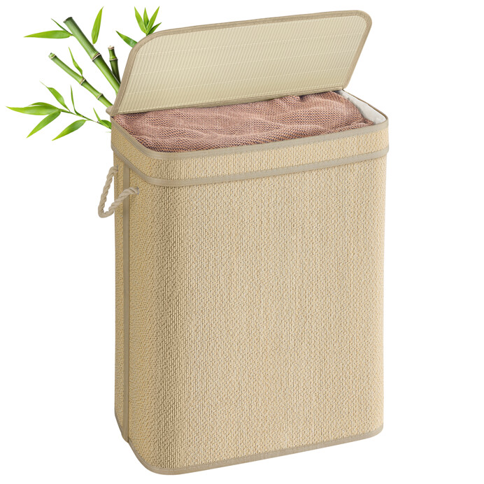 Koš na prádlo o rozměrech 49x33x61 cm je vyroben z přírodního bambusu, který zajišťuje pevné a stabilní provedení. Nosné vzpěry z kovu dodávají koši potřebnou tuhost a umožňují snadné udržení tvaru i při plném naplnění. Praktické madlo usnadňuje manipulaci a přenášení koše. Vnitřní část je vybavena textilní vložkou, která usnadňuje ukládání prádla a zároveň chrání bambusovou strukturu. Díky přírodnímu odstínu se koš hodí do různých typů interiérů, kde přináší funkční a zároveň estetický prvek.